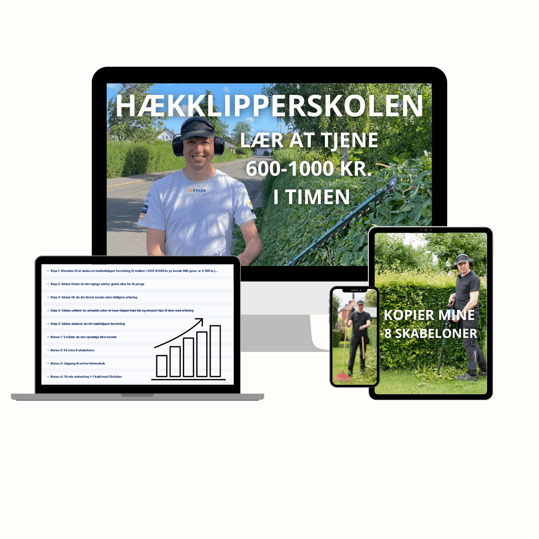 Det bedste er, at du også kan gøre det. Jeg viser dig, hvordan du får kunder og bygger din egen hækkeklipperforretning. Du får de samme enkle metoder og skabeloner, som jeg har brugt.